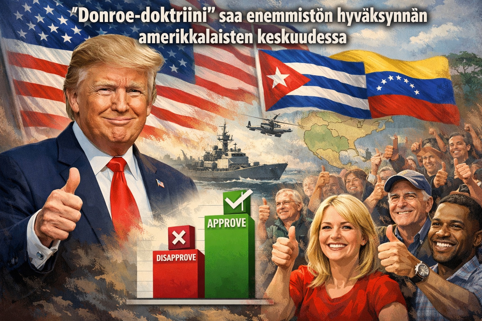 Trump ulkopolitiikka I&I TIPP kysely 2026, Donroe-doktriini selitys, amerikkalaisten mielipide Trumpista, Yhdysvallat Venezuela Kuuba pakotteet, Trump läntinen pallonpuolisko politiikka, I&I TIPP poll tulokset, US foreign policy activism 2026, Lucianne uutinen Trump kysely.